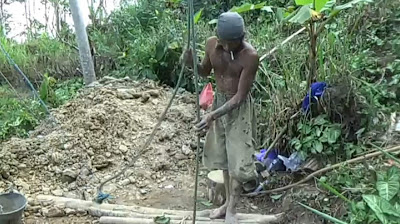 Berbekal alat yang seadanya, dua orang tersebut mulai menggali sumur, tak jarang sebelum air keluar, mereka terlebih dahulu harus memecah batu, menggunakan paji. Pekerjaan ini selalu menghampiri dirinya setiap tahun pada musim kemarau.